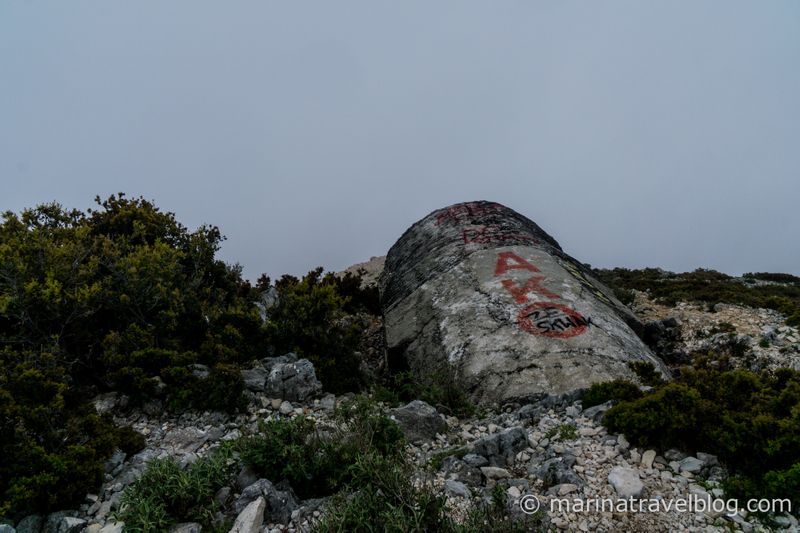 В какой-то момент тропинка заканчивается и начинается лазание по камням. В сложных местах натянуты веревки.