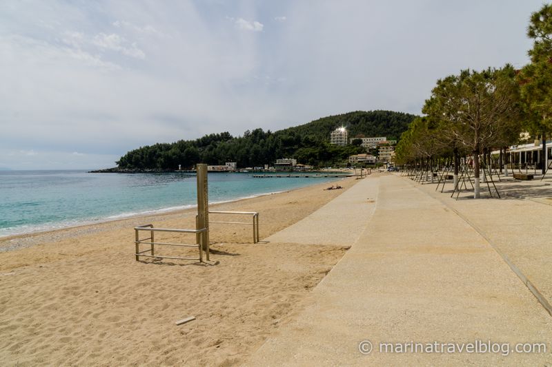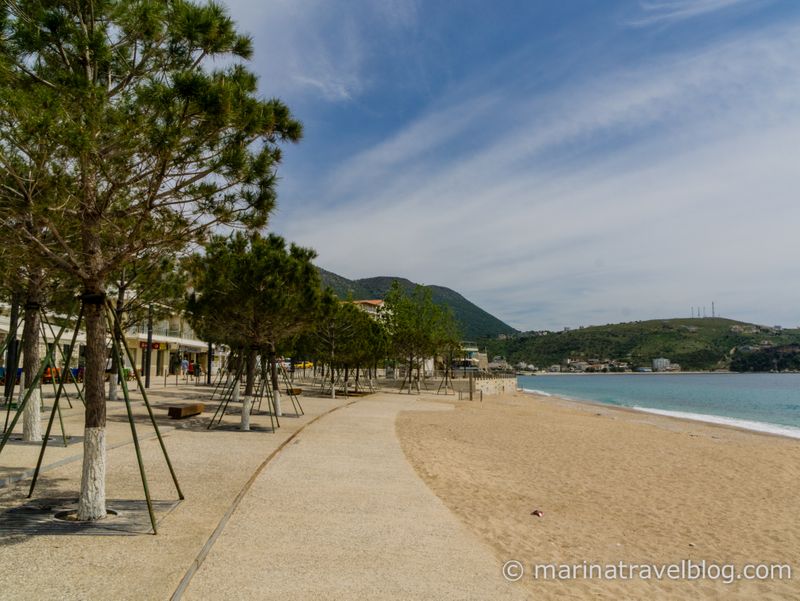 В пляж находится прямо в городе, и это лучший пляж на Албанской Ривьере: он просторный, там больше песка, а не гальки, ухоженная территория, есть тень и душ. Вдоль пляжа ресторанчики, магазинчики, и вообще уютно.
