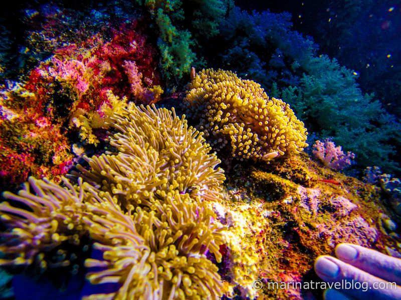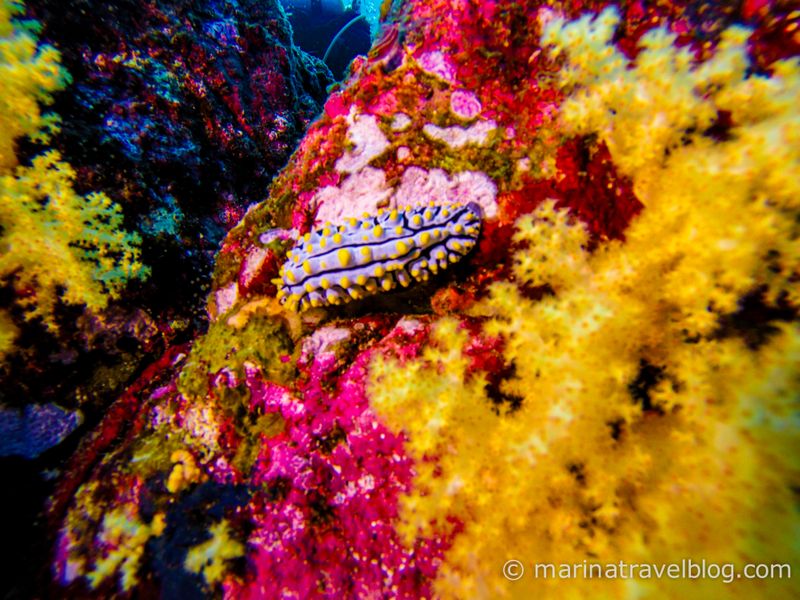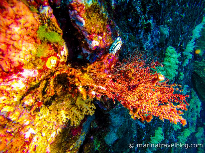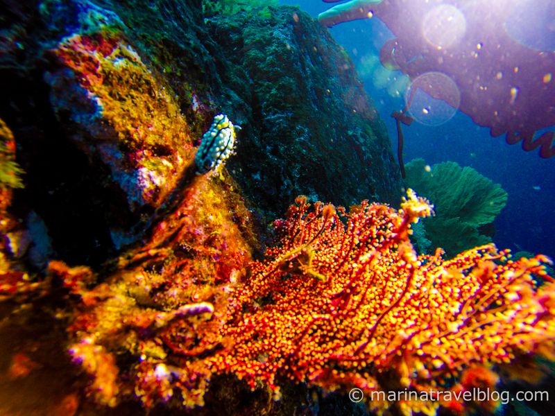 Интерес представляет в основном живность, которая прячется в трещинах, большей частью небольшие организмы. Nudibranch отлично получаются на фоне желтых кораллов. Если у Вас есть крутая фототехника для макросъемки, Вы сделаете здесь отличные кадры! Не то что у меня с гоупро :).