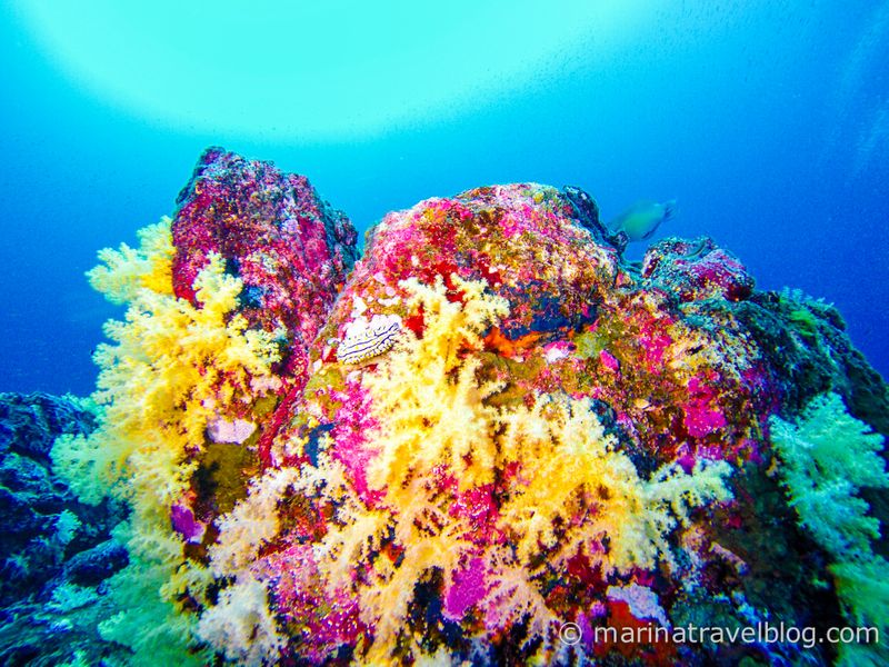 Названием этот дайв сайт обязан желтым кораллам, которые покрывают подводную скалу. Вершина на глубине 18 метров, все интересное в основном ниже 25 метров. Так что без найтрокса дайв получается очень короткий.