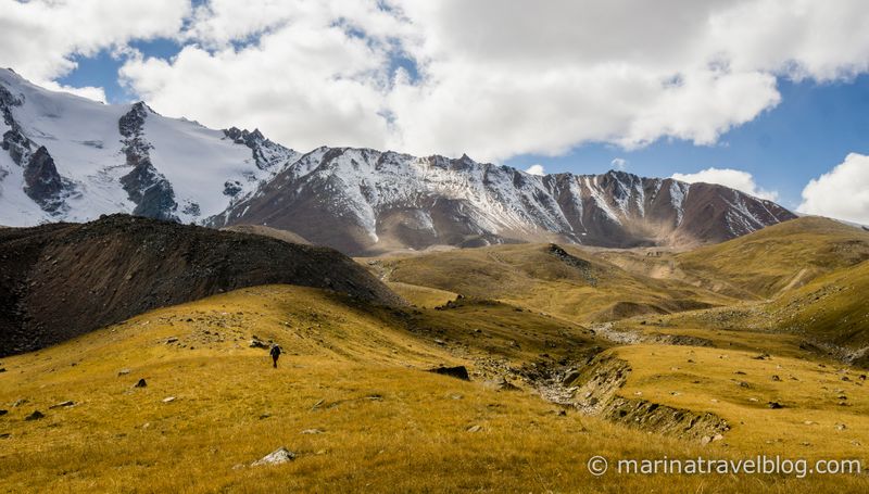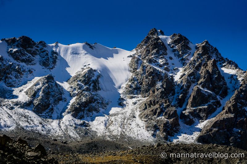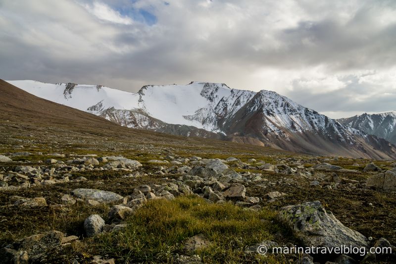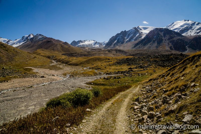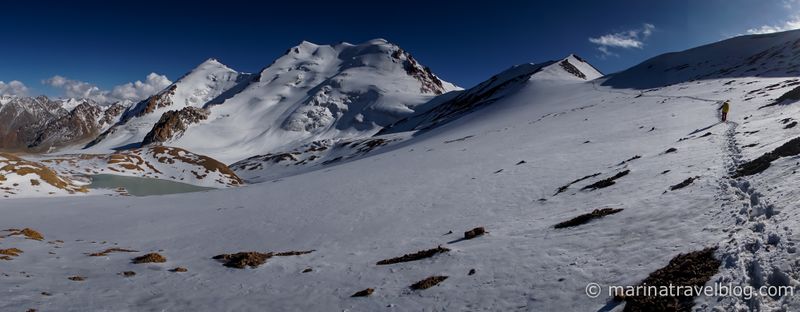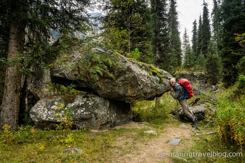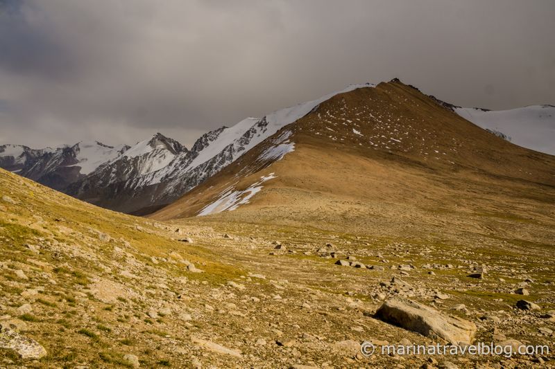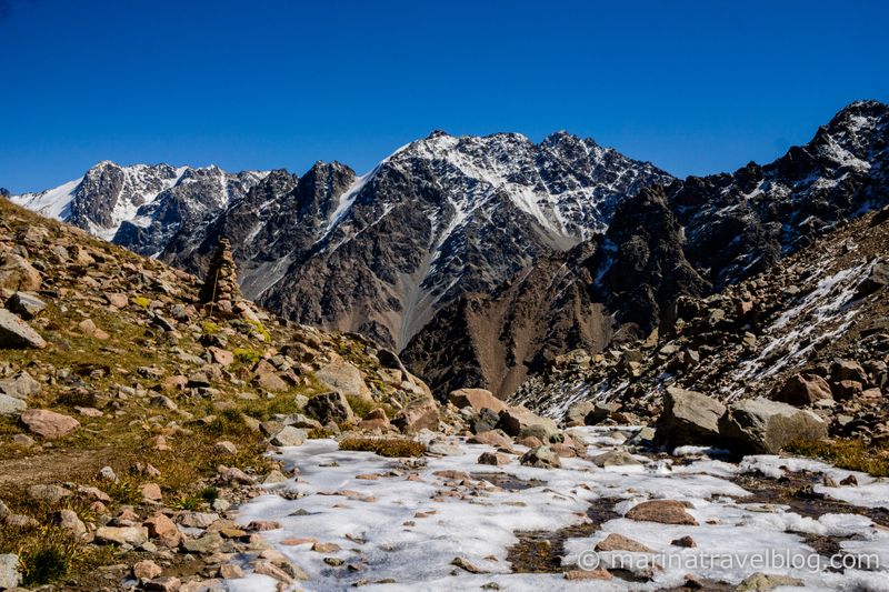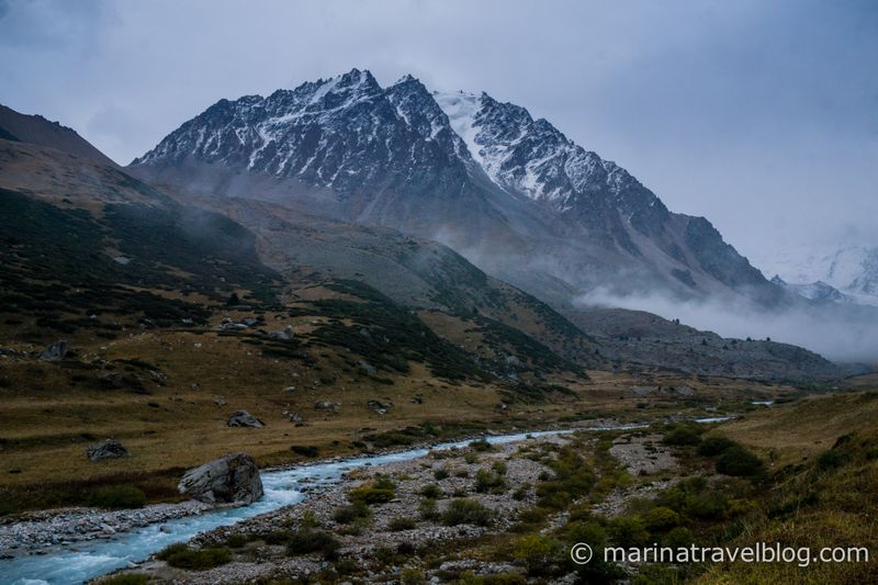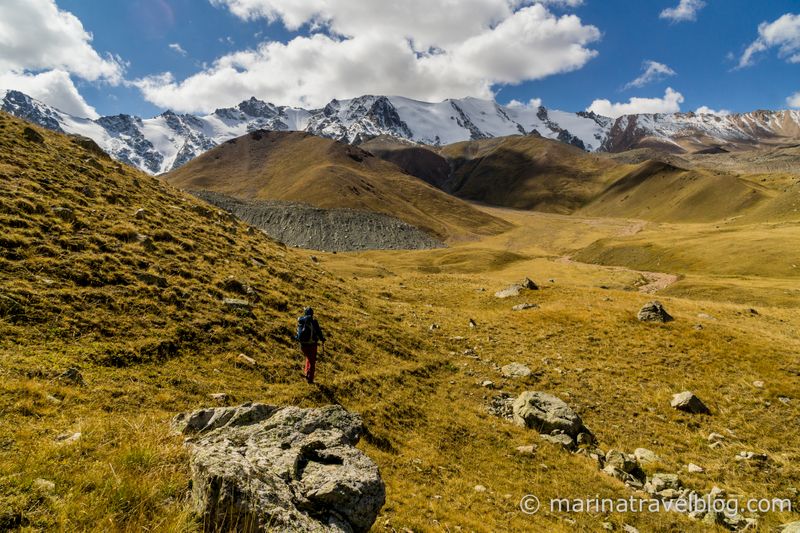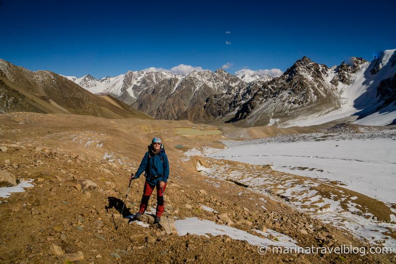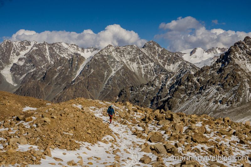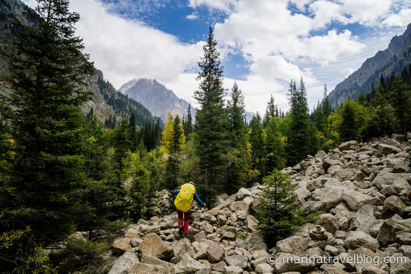 По остальному, какое-то особое снаряжение на Тянь-Шань не нужно, тропа большей частью легкая, есть только немного сыпухи (я писала о ней выше), в обычных треккинговых кроссовках вполне нормально идти. В трейлрановых кроссовках в сеточку будет холодновато, и некомфортно идти по снегу на перевале.
