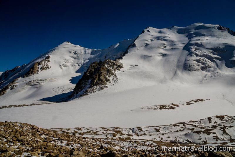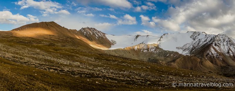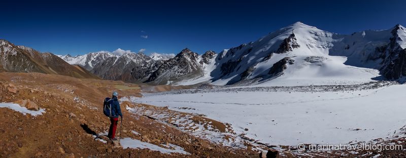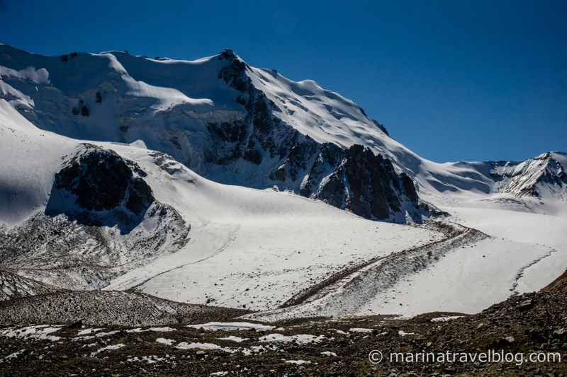 Утром вышло солнце, и сразу стало хорошо. Денек ясный, на небе ни облачка, и вообще на подъеме на перевал Туристов классные виды на окружающие ледники.
