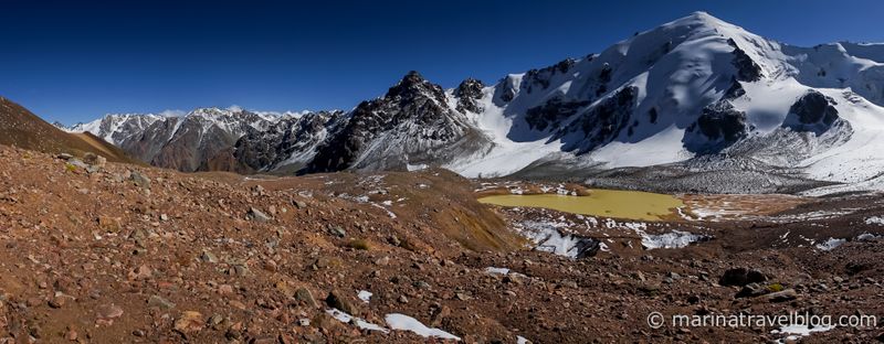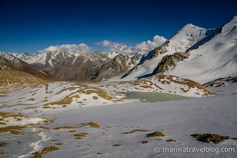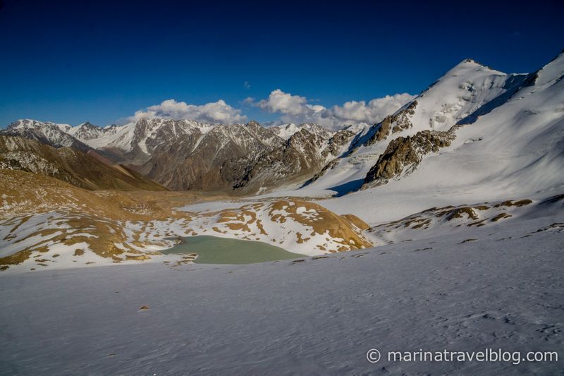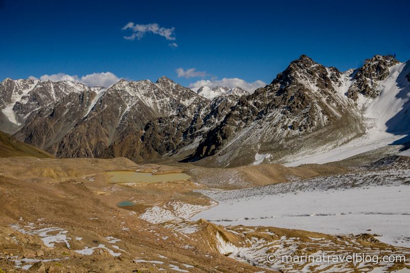 Наверху под перевалом есть пара озер, но одно из них мутное.