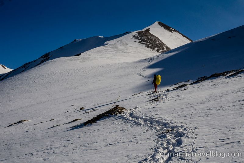 На перевал Туристов поднялись аж в 16:30. Тропа по снегу была хорошо протоптана, а сам снег плотный. Перед нами прошла большая тургруппа, как раз отлично все вытоптали :)