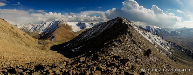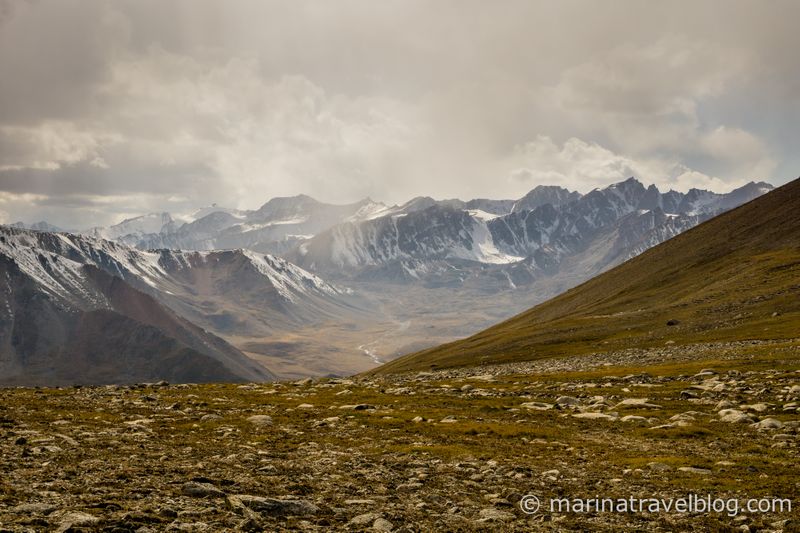 С перевала на другую сторону тоже было нереально красиво, виды сразу на несколько хребтов, мы очень порадовались, что решили сюда забраться. Горы Пила, Астроном, Вечерняя, пики Узловой и Каргалинский.