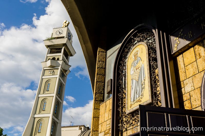 Первым мы посетили Собор Святого Климента Охридского (Соборна Црква) - это кафедральный собор Скопье, построенный в конце 20 века. Раньше на этом месте стоял Собор Девы Марии, но его сожгли фашисты. Размеры ротонды 36*36 метров. Для освещения внутри церкви используется 400 лампочек. Дизайнер - Славко Брезовски.